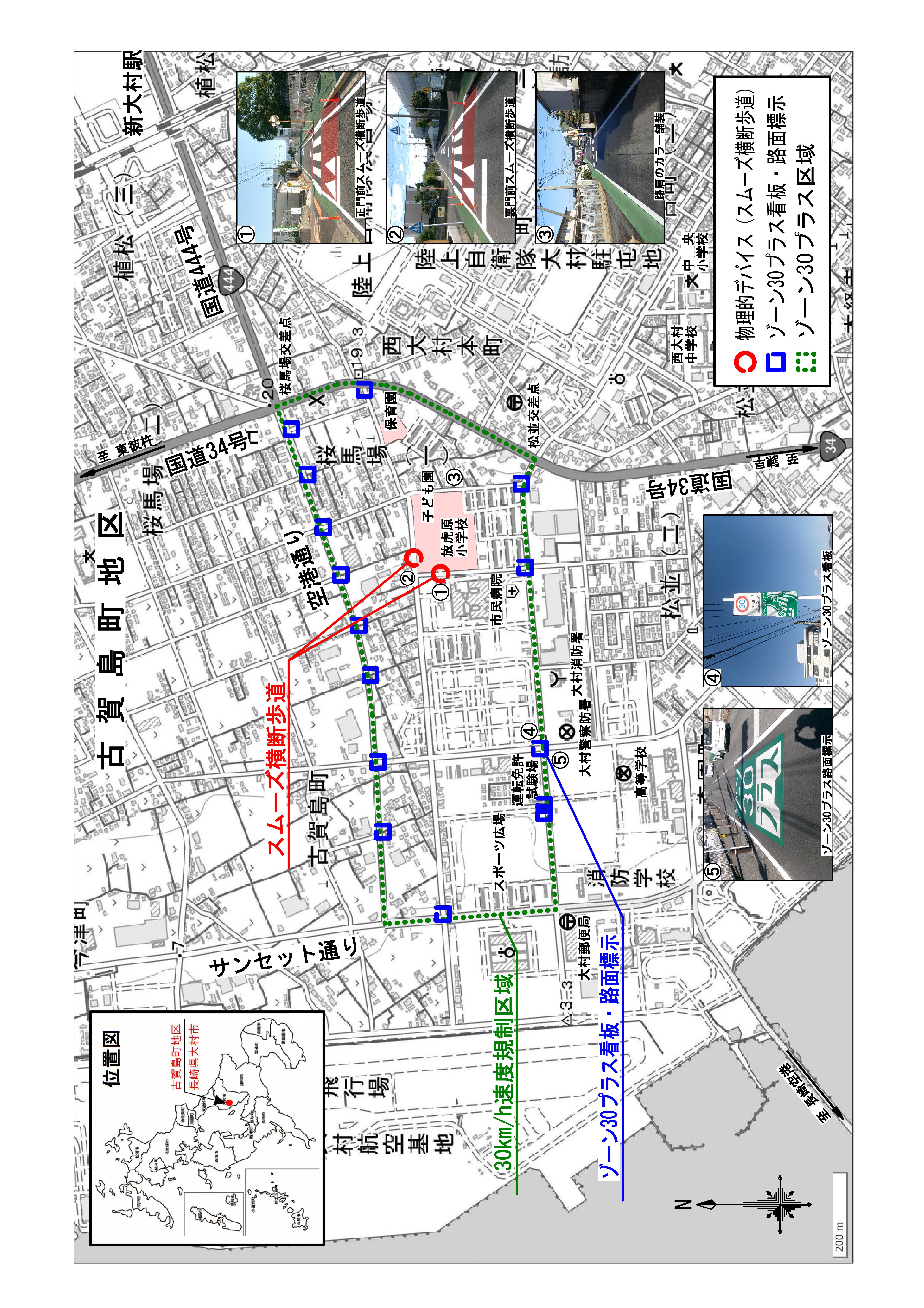 主な対策内容として、スムーズ横断歩道、路肩のカラー舗装、ゾーン30プラス看板および路面標示を整備。