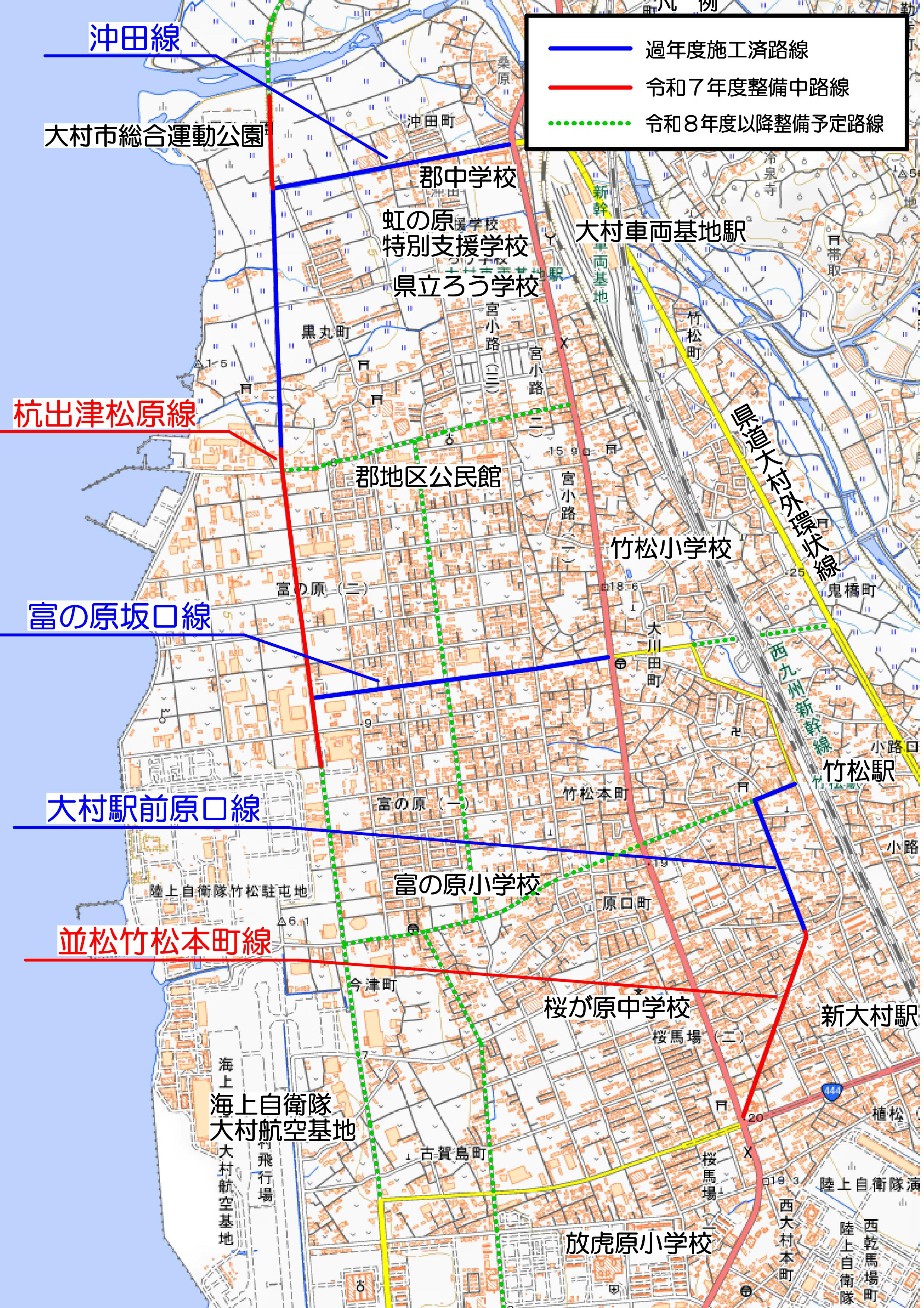 令和7年度は市道杭出津松原線と市道並松竹松本町線などで「車道混在」型の整備を行っており、次年度以降も順次整備を予定しています。